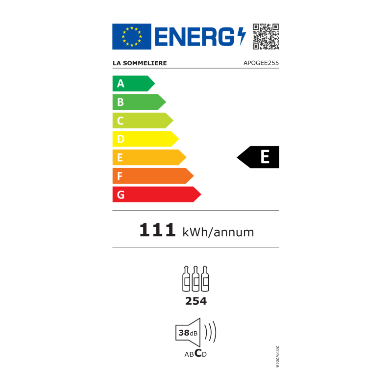 Cave à vin La Sommelière APOGEE255 - Cave à vin de vieillissement - 254 bouteilles - 1 zone - Silencieux (38 à 40 dB) - L x H x P: 65.5 x 177 x 69 cm - Noir
